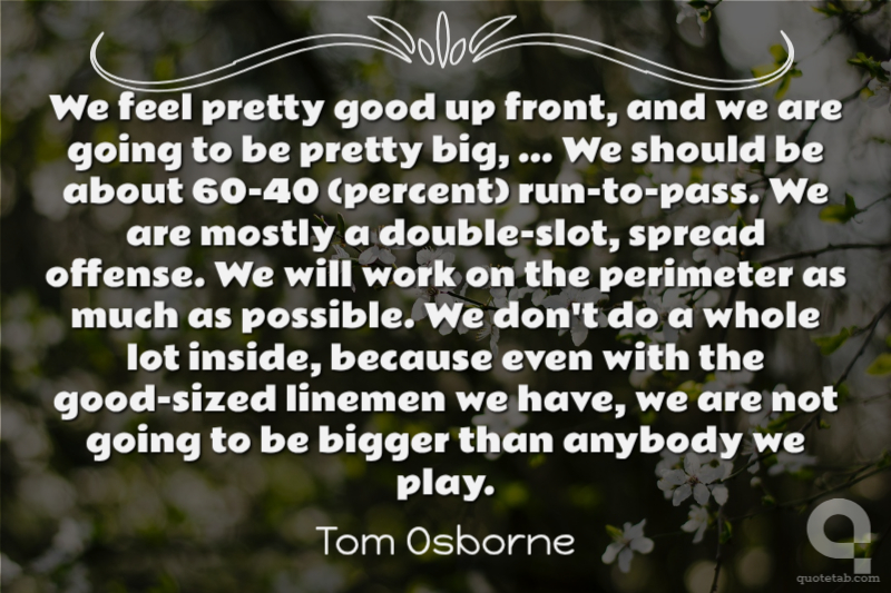 We feel pretty good up front, and we are going to be pretty big, ... We should be about 60-40 (percent) run-to-pass. We are mostly a double-slot, spread offense. We will work on the perimeter as much as possible. We don't do a whole lot inside, because even with the good-sized linemen we have, we are not going to be bigger than anybody we play.