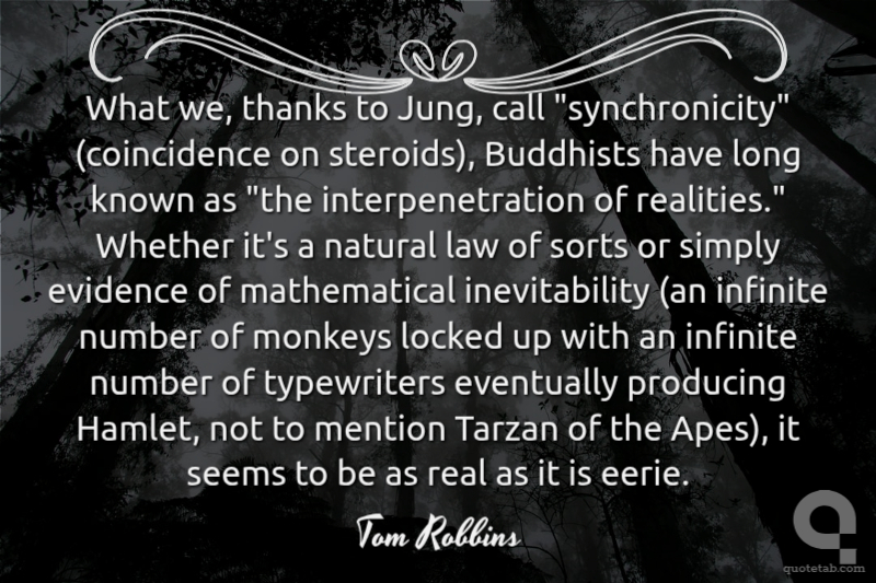 What we, thanks to Jung, call "synchronicity" (coincidence on steroids), Buddhists have long known as "the interpenetration of realities." Whether it's a natural law of sorts or simply evidence of mathematical inevitability (an infinite number of monkeys locked up with an infinite number of typewriters eventually producing Hamlet, not to mention Tarzan of the Apes), it seems to be as real as it is eerie.