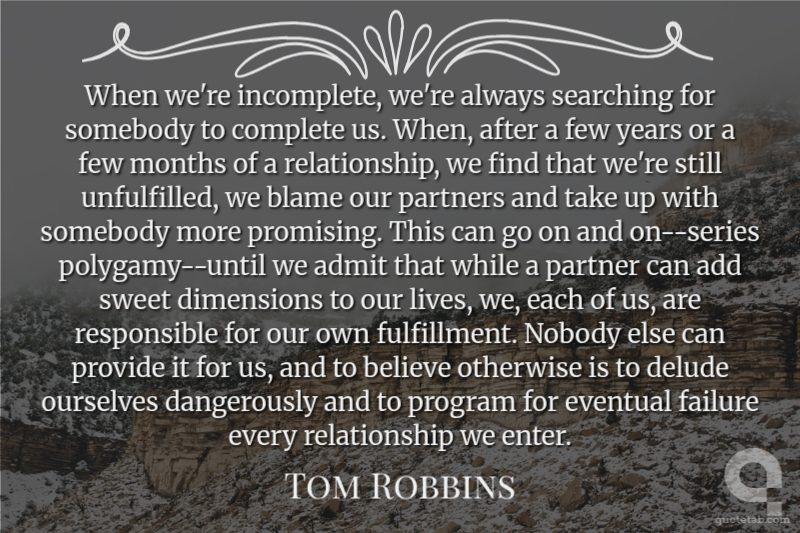 When we're incomplete, we're always searching for somebody to complete us. When, after a few years or a few months of a relationship, we find that we're still unfulfilled, we blame our partners and take up with somebody more promising. This can go on and on--series polygamy--until we admit that while a partner can add sweet dimensions to our lives, we, each of us, are responsible for our own fulfillment. Nobody else can provide it for us, and to believe otherwise is to delude ourselves dangerously and to program for eventual failure every relationship we enter.
