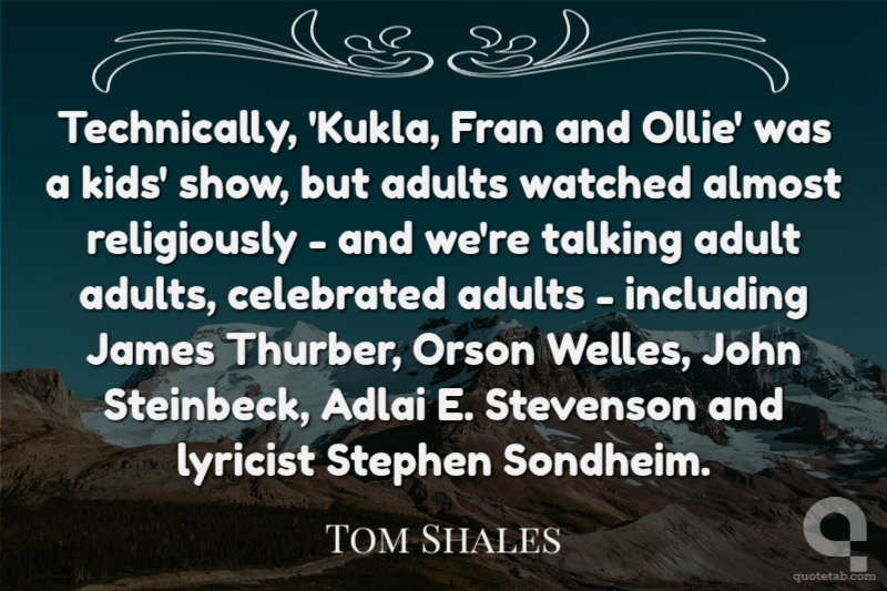 Technically, 'Kukla, Fran and Ollie' was a kids' show, but adults watched almost religiously - and we're talking adult adults, celebrated adults - including James Thurber, Orson Welles, John Steinbeck, Adlai E. Stevenson and lyricist Stephen Sondheim.