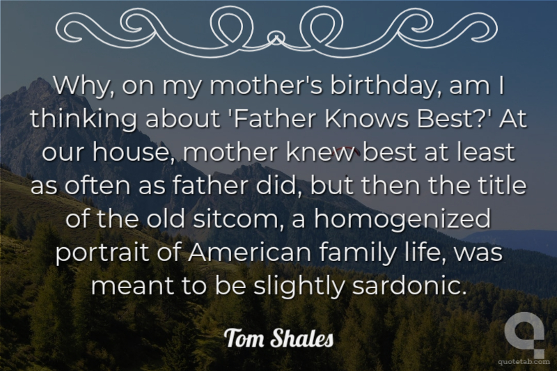 Why, on my mother's birthday, am I thinking about 'Father Knows Best?' At our house, mother knew best at least as often as father did, but then the title of the old sitcom, a homogenized portrait of American family life, was meant to be slightly sardonic.