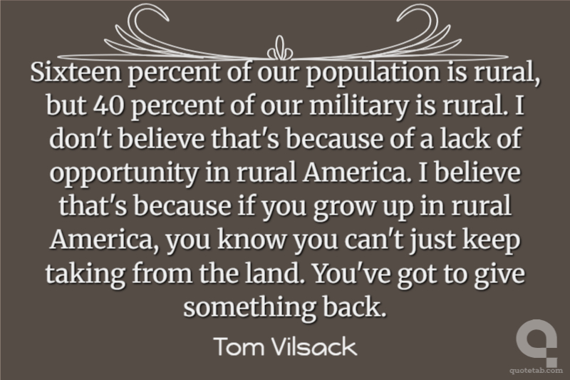 Sixteen percent of our population is rural, but 40 percent of our military is rural. I don't believe that's because of a lack of opportunity in rural America. I believe that's because if you grow up in rural America, you know you can't just keep taking from the land. You've got to give something back.