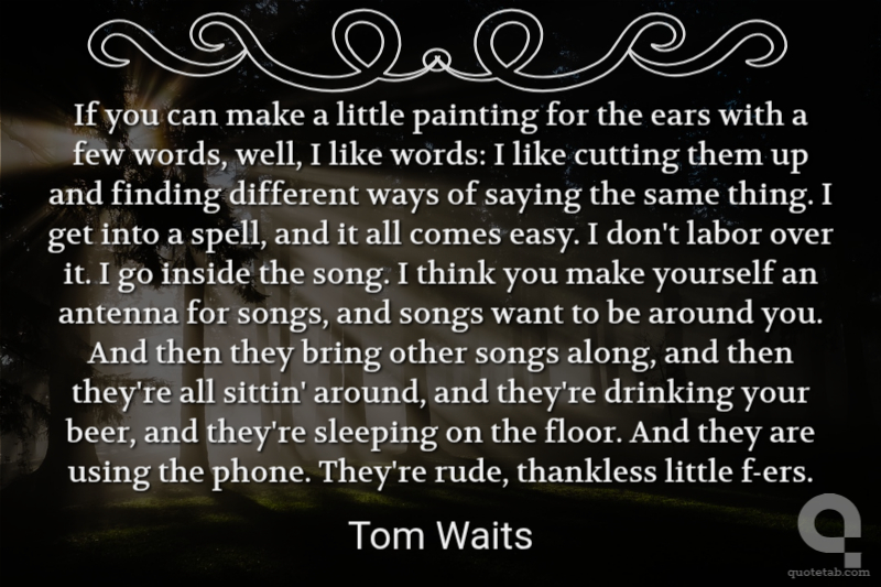 If you can make a little painting for the ears with a few words, well, I like words: I like cutting them up and finding different ways of saying the same thing. I get into a spell, and it all comes easy. I don't labor over it. I go inside the song. I think you make yourself an antenna for songs, and songs want to be around you. And then they bring other songs along, and then they're all sittin' around, and they're drinking your beer, and they're sleeping on the floor. And they are using the phone. They're rude, thankless little f-ers.