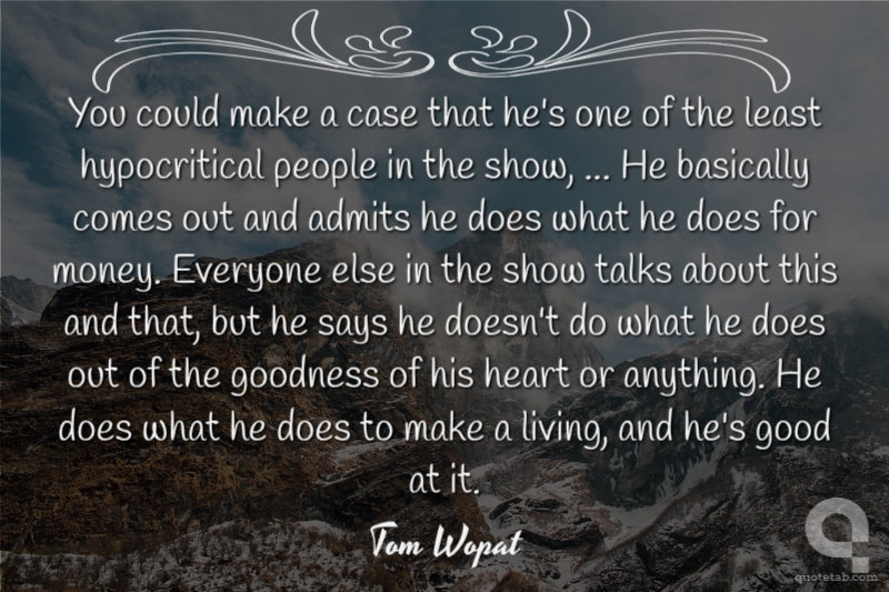 You could make a case that he's one of the least hypocritical people in the show, ... He basically comes out and admits he does what he does for money. Everyone else in the show talks about this and that, but he says he doesn't do what he does out of the goodness of his heart or anything. He does what he does to make a living, and he's good at it.