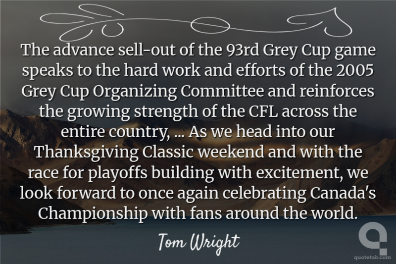 The advance sell-out of the 93rd Grey Cup game speaks to the hard work and efforts of the 2005 Grey Cup Organizing Committee and reinforces the growing strength of the CFL across the entire country, ... As we head into our Thanksgiving Classic weekend and with the race for playoffs building with excitement, we look forward to once again celebrating Canada's Championship with fans around the world.