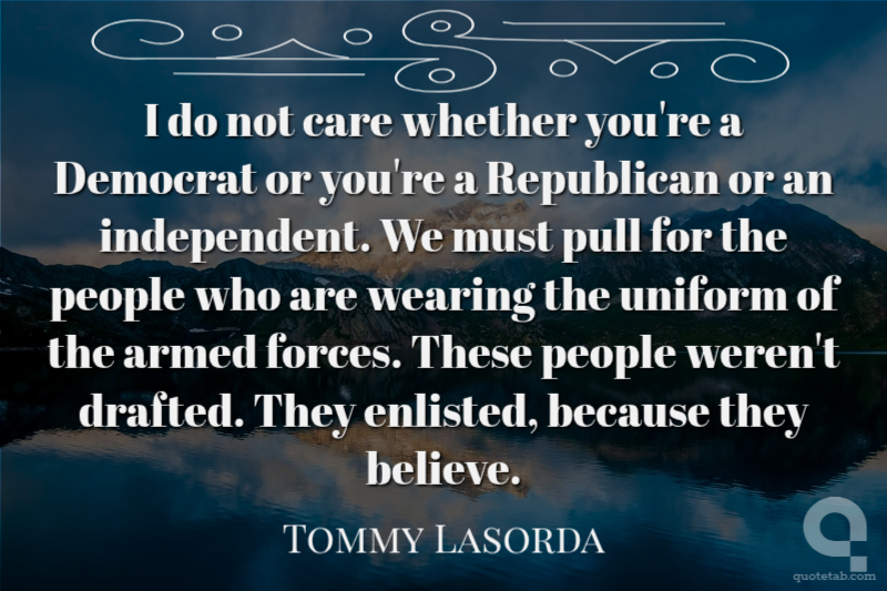 I do not care whether you're a Democrat or you're a Republican or an independent. We must pull for the people who are wearing the uniform of the armed forces. These people weren't drafted. They enlisted, because they believe.