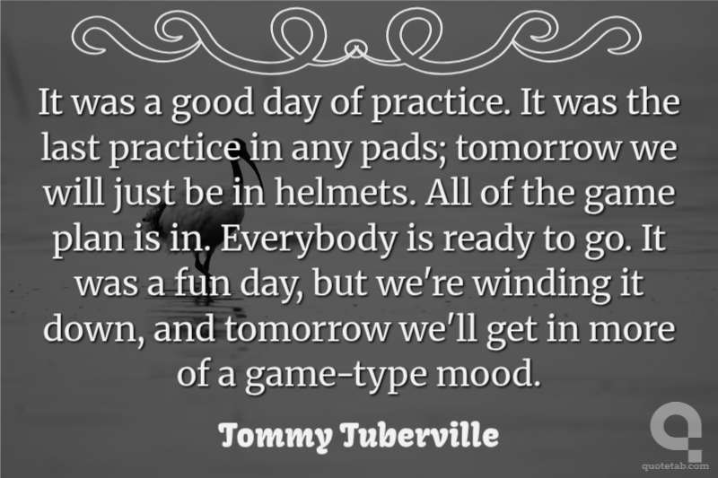 It was a good day of practice. It was the last practice in any pads; tomorrow we will just be in helmets. All of the game plan is in. Everybody is ready to go. It was a fun day, but we're winding it down, and tomorrow we'll get in more of a game-type mood.