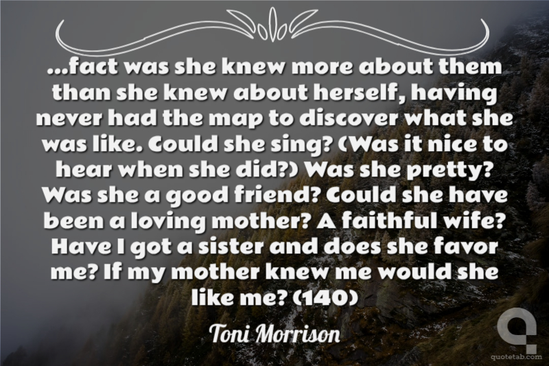 ...fact was she knew more about them than she knew about herself, having never had the map to discover what she was like. Could she sing? (Was it nice to hear when she did?) Was she pretty? Was she a good friend? Could she have been a loving mother? A faithful wife? Have I got a sister and does she favor me? If my mother knew me would she like me? (140)