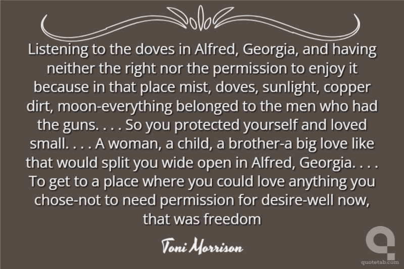 Listening to the doves in Alfred, Georgia, and having neither the right nor the permission to enjoy it because in that place mist, doves, sunlight, copper dirt, moon-everything belonged to the men who had the guns. . . . So you protected yourself and loved small. . . . A woman, a child, a brother-a big love like that would split you wide open in Alfred, Georgia. . . . To get to a place where you could love anything you chose-not to need permission for desire-well now, that was freedom