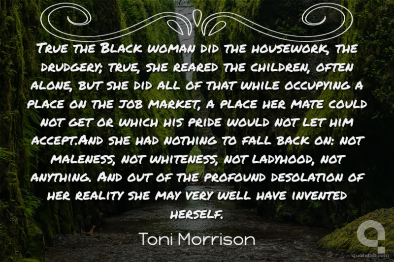 True the Black woman did the housework, the drudgery; true, she reared the children, often alone, but she did all of that while occupying a place on the job market, a place her mate could not get or which his pride would not let him accept.And she had nothing to fall back on: not maleness, not whiteness, not ladyhood, not anything. And out of the profound desolation of her reality she may very well have invented herself.
