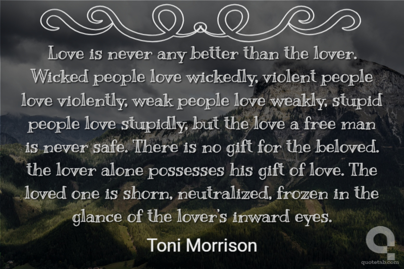 Love is never any better than the lover. Wicked people love wickedly, violent people love violently, weak people love weakly, stupid people love stupidly, but the love a free man is never safe. There is no gift for the beloved. the lover alone possesses his gift of love. The loved one is shorn, neutralized, frozen in the glance of the lover’s inward eyes.