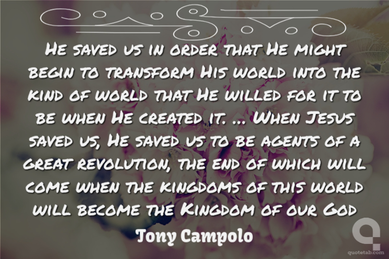 He saved us in order that He might begin to transform His world into the kind of world that He willed for it to be when He created it. … When Jesus saved us, He saved us to be agents of a great revolution, the end of which will come when the kingdoms of this world will become the Kingdom of our God