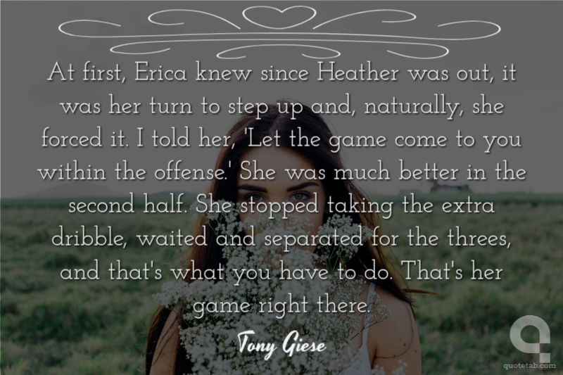 At first, Erica knew since Heather was out, it was her turn to step up and, naturally, she forced it. I told her, 'Let the game come to you within the offense.' She was much better in the second half. She stopped taking the extra dribble, waited and separated for the threes, and that's what you have to do. That's her game right there.