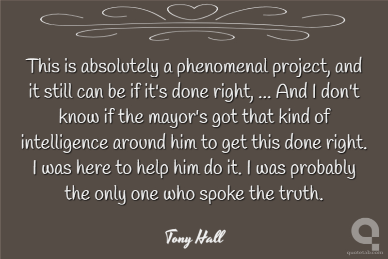 This is absolutely a phenomenal project, and it still can be if it's done right, ... And I don't know if the mayor's got that kind of intelligence around him to get this done right. I was here to help him do it. I was probably the only one who spoke the truth.