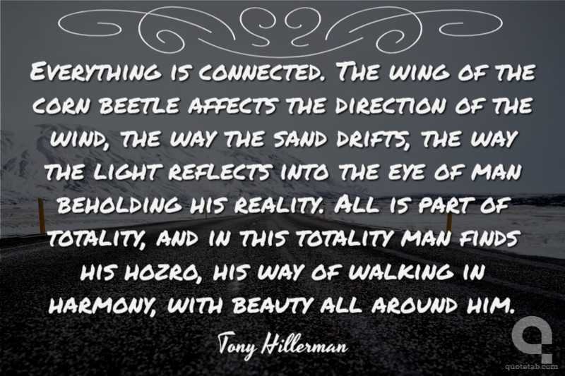 Everything is connected. The wing of the corn beetle affects the direction of the wind, the way the sand drifts, the way the light reflects into the eye of man beholding his reality. All is part of totality, and in this totality man finds his hozro, his way of walking in harmony, with beauty all around him.