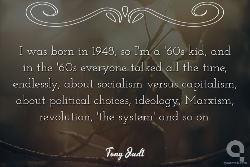 I was born in 1948, so I'm a '60s kid, and in the '60s everyone talked all the time, endlessly, about socialism versus capitalism, about political choices, ideology, Marxism, revolution, 'the system' and so on.