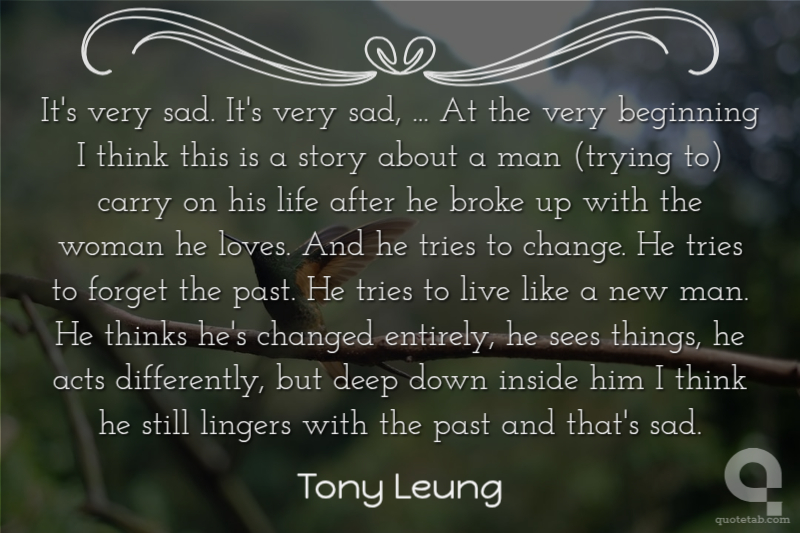 It's very sad. It's very sad, ... At the very beginning I think this is a story about a man (trying to) carry on his life after he broke up with the woman he loves. And he tries to change. He tries to forget the past. He tries to live like a new man. He thinks he's changed entirely, he sees things, he acts differently, but deep down inside him I think he still lingers with the past and that's sad.