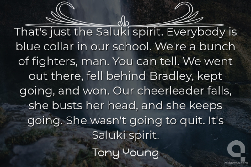 That's just the Saluki spirit. Everybody is blue collar in our school. We're a bunch of fighters, man. You can tell. We went out there, fell behind Bradley, kept going, and won. Our cheerleader falls, she busts her head, and she keeps going. She wasn't going to quit. It's Saluki spirit.