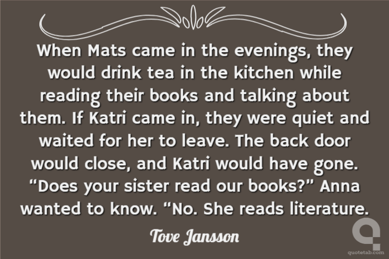 When Mats came in the evenings, they would drink tea in the kitchen while reading their books and talking about them. If Katri came in, they were quiet and waited for her to leave. The back door would close, and Katri would have gone. “Does your sister read our books?” Anna wanted to know. “No. She reads literature.