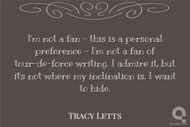 I'm not a fan - this is a personal preference - I'm not a fan of tour-de-force writing. I admire it, but it's not where my inclination is. I want to hide.
