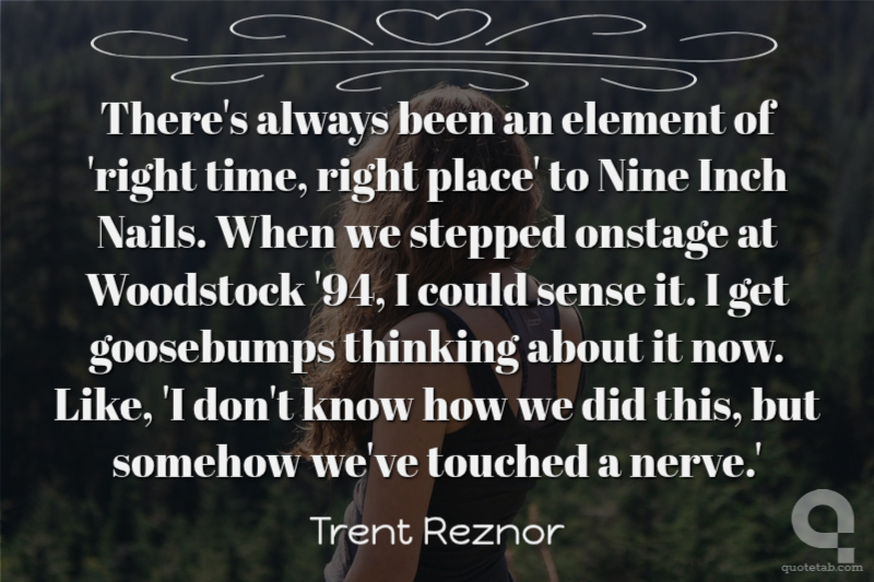 There's always been an element of 'right time, right place' to Nine Inch Nails. When we stepped onstage at Woodstock '94, I could sense it. I get goosebumps thinking about it now. Like, 'I don't know how we did this, but somehow we've touched a nerve.'