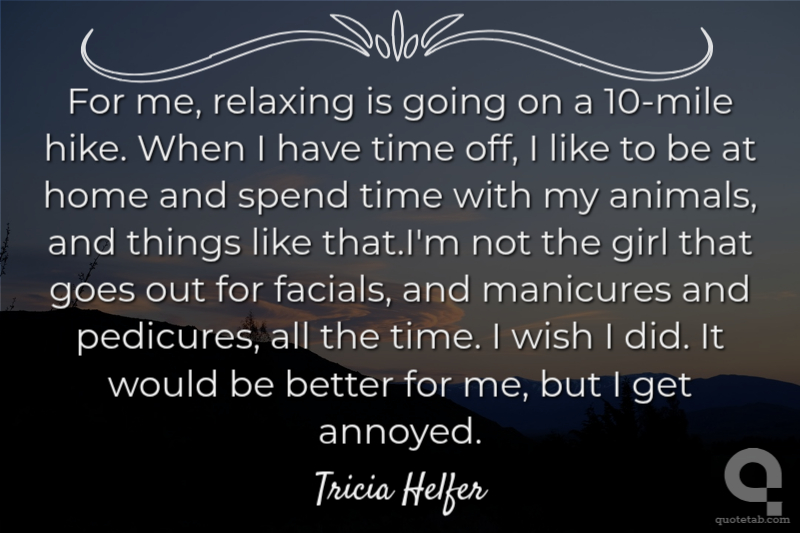 For me, relaxing is going on a 10-mile hike. When I have time off, I like to be at home and spend time with my animals, and things like that.I'm not the girl that goes out for facials, and manicures and pedicures, all the time. I wish I did. It would be better for me, but I get annoyed.