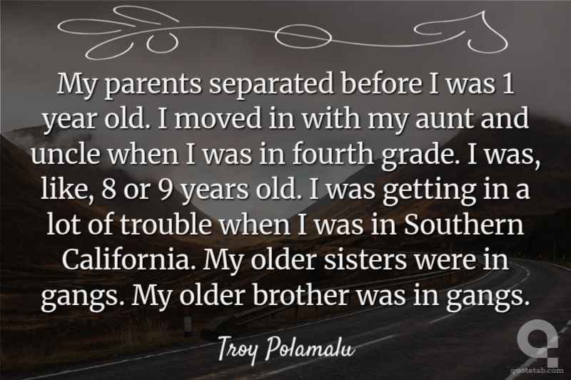 My parents separated before I was 1 year old. I moved in with my aunt and uncle when I was in fourth grade. I was, like, 8 or 9 years old. I was getting in a lot of trouble when I was in Southern California. My older sisters were in gangs. My older brother was in gangs.