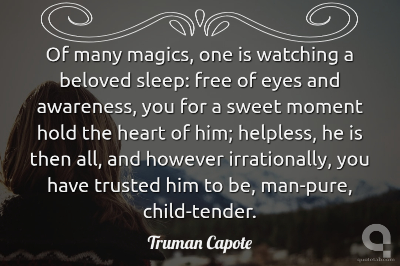 Of many magics, one is watching a beloved sleep: free of eyes and awareness, you for a sweet moment hold the heart of him; helpless, he is then all, and however irrationally, you have trusted him to be, man-pure, child-tender.