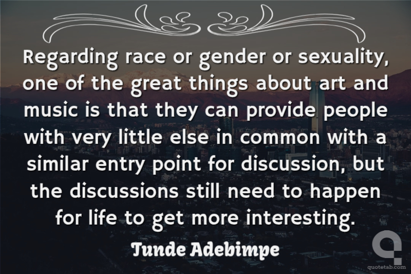 Regarding race or gender or sexuality, one of the great things about art and music is that they can provide people with very little else in common with a similar entry point for discussion, but the discussions still need to happen for life to get more interesting.