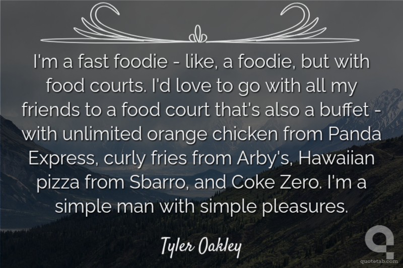 I'm a fast foodie - like, a foodie, but with food courts. I'd love to go with all my friends to a food court that's also a buffet - with unlimited orange chicken from Panda Express, curly fries from Arby's, Hawaiian pizza from Sbarro, and Coke Zero. I'm a simple man with simple pleasures.