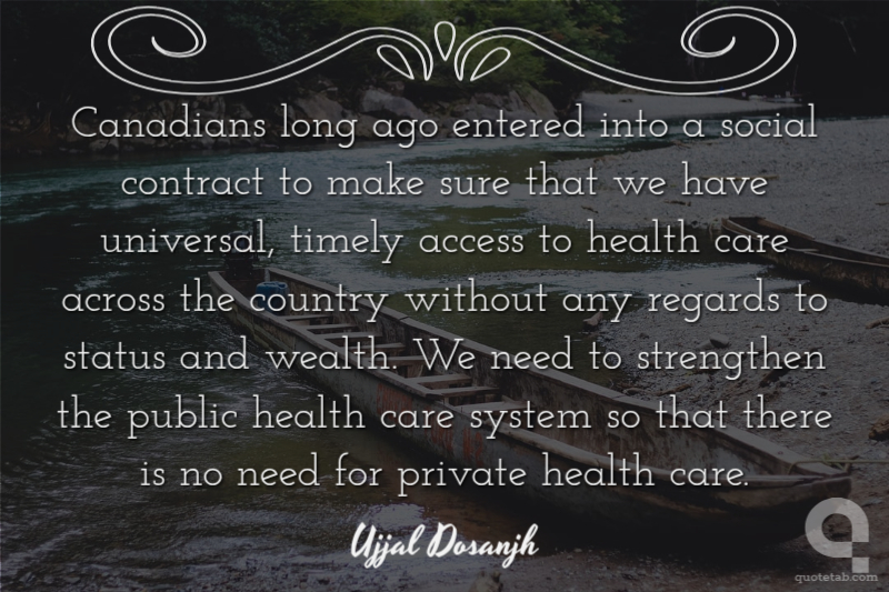 Canadians long ago entered into a social contract to make sure that we have universal, timely access to health care across the country without any regards to status and wealth. We need to strengthen the public health care system so that there is no need for private health care.