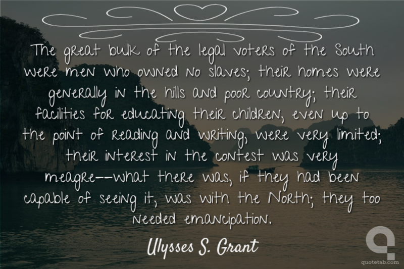 The great bulk of the legal voters of the South were men who owned no slaves; their homes were generally in the hills and poor country; their facilities for educating their children, even up to the point of reading and writing, were very limited; their interest in the contest was very meagre--what there was, if they had been capable of seeing it, was with the North; they too needed emancipation.