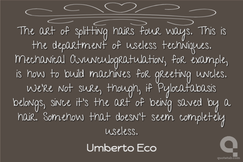 The art of splitting hairs four ways. This is the department of useless techniques. Mechanical Avunculogratulation, for example, is how to build machines for greeting uncles. We're not sure, though, if Pylocatabasis belongs, since it's the art of being saved by a hair. Somehow that doesn't seem completely useless.