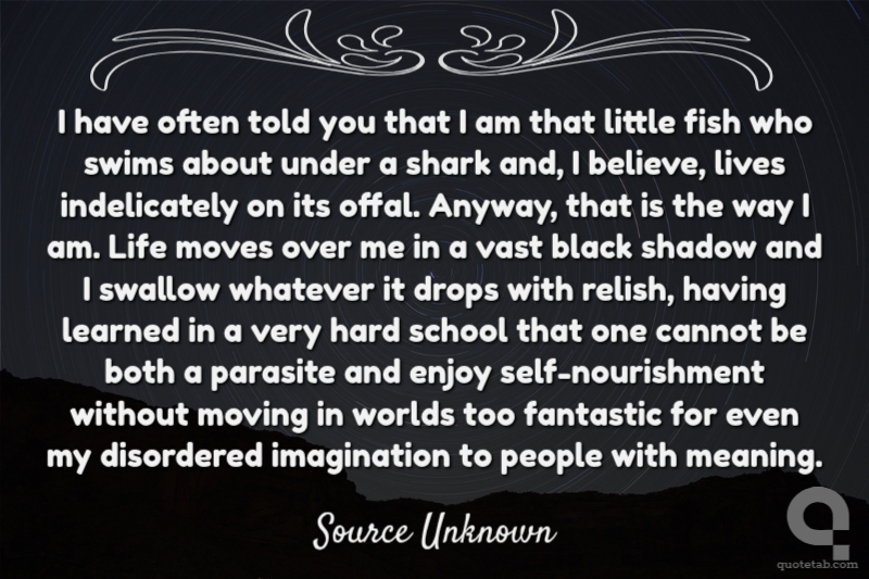I have often told you that I am that little fish who swims about under a shark and, I believe, lives indelicately on its offal. Anyway, that is the way I am. Life moves over me in a vast black shadow and I swallow whatever it drops with relish, having learned in a very hard school that one cannot be both a parasite and enjoy self-nourishment without moving in worlds too fantastic for even my disordered imagination to people with meaning.