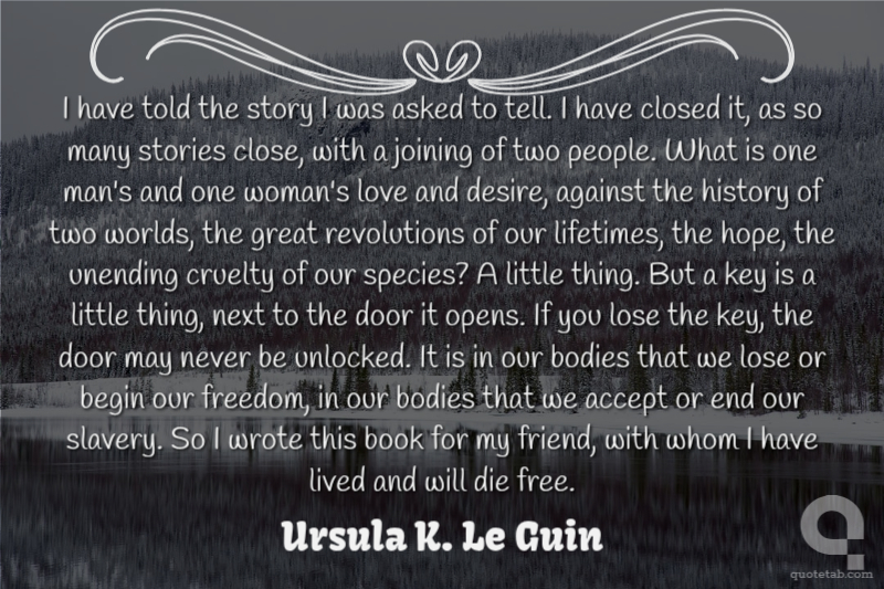 I have told the story I was asked to tell. I have closed it, as so many stories close, with a joining of two people. What is one man's and one woman's love and desire, against the history of two worlds, the great revolutions of our lifetimes, the hope, the unending cruelty of our species? A little thing. But a key is a little thing, next to the door it opens. If you lose the key, the door may never be unlocked. It is in our bodies that we lose or begin our freedom, in our bodies that we accept or end our slavery. So I wrote this book for my friend, with whom I have lived and will die free.
