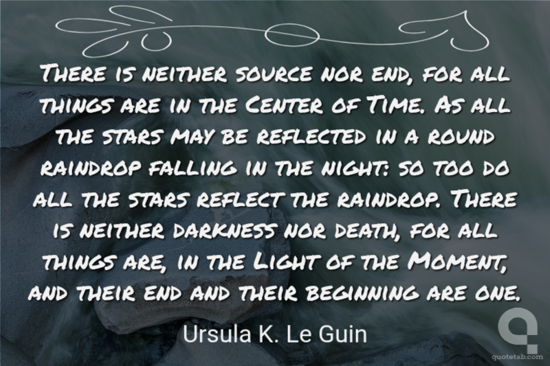 There is neither source nor end, for all things are in the Center of Time. As all the stars may be reflected in a round raindrop falling in the night: so too do all the stars reflect the raindrop. There is neither darkness nor death, for all things are, in the Light of the Moment, and their end and their beginning are one.