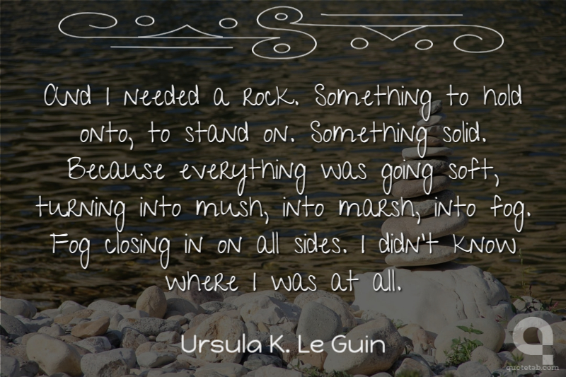 And I needed a rock. Something to hold onto, to stand on. Something solid. Because everything was going soft, turning into mush, into marsh, into fog. Fog closing in on all sides. I didn't know where I was at all.
