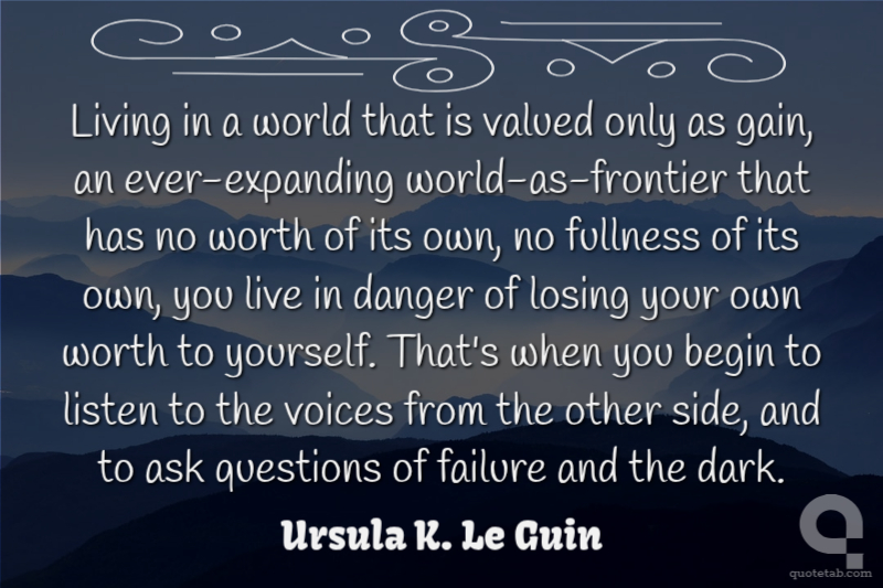 Living in a world that is valued only as gain, an ever-expanding world-as-frontier that has no worth of its own, no fullness of its own, you live in danger of losing your own worth to yourself. That's when you begin to listen to the voices from the other side, and to ask questions of failure and the dark.