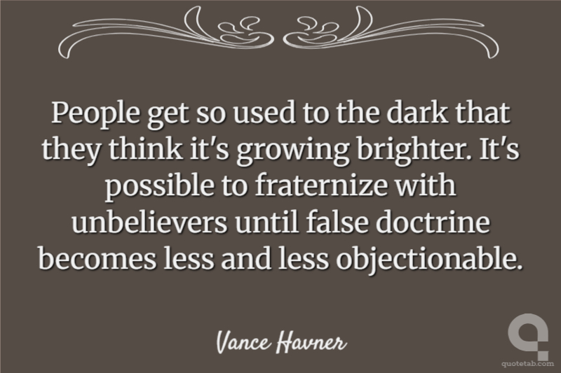 People get so used to the dark that they think it's growing brighter. It's possible to fraternize with unbelievers until false doctrine becomes less and less objectionable.
