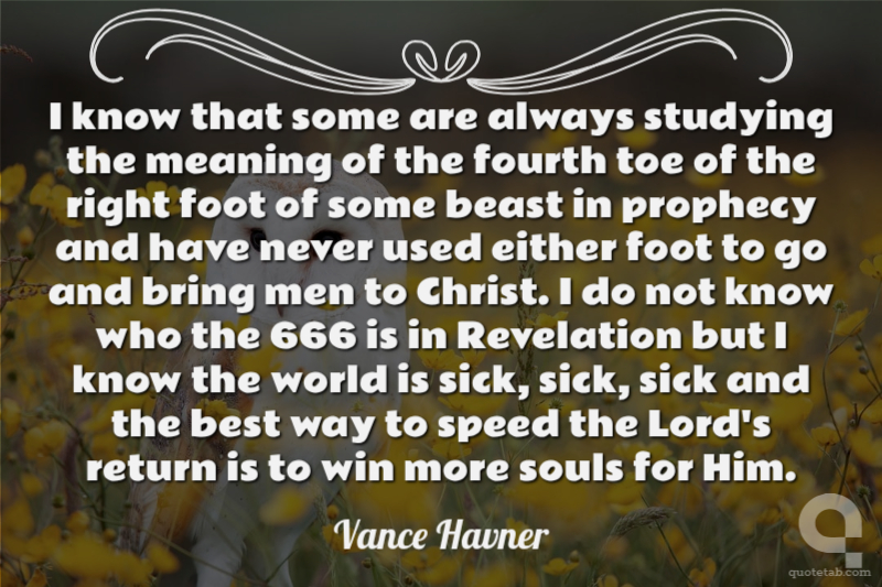 I know that some are always studying the meaning of the fourth toe of the right foot of some beast in prophecy and have never used either foot to go and bring men to Christ. I do not know who the 666 is in Revelation but I know the world is sick, sick, sick and the best way to speed the Lord's return is to win more souls for Him.