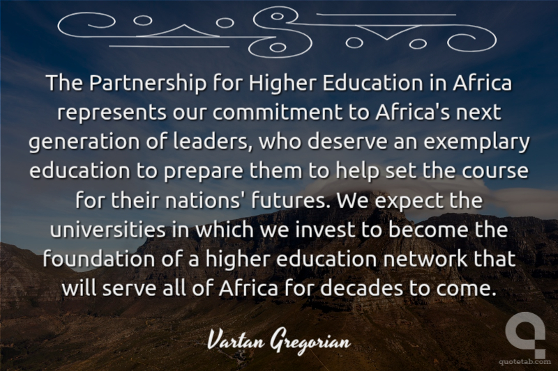 The Partnership for Higher Education in Africa represents our commitment to Africa's next generation of leaders, who deserve an exemplary education to prepare them to help set the course for their nations' futures. We expect the universities in which we invest to become the foundation of a higher education network that will serve all of Africa for decades to come.
