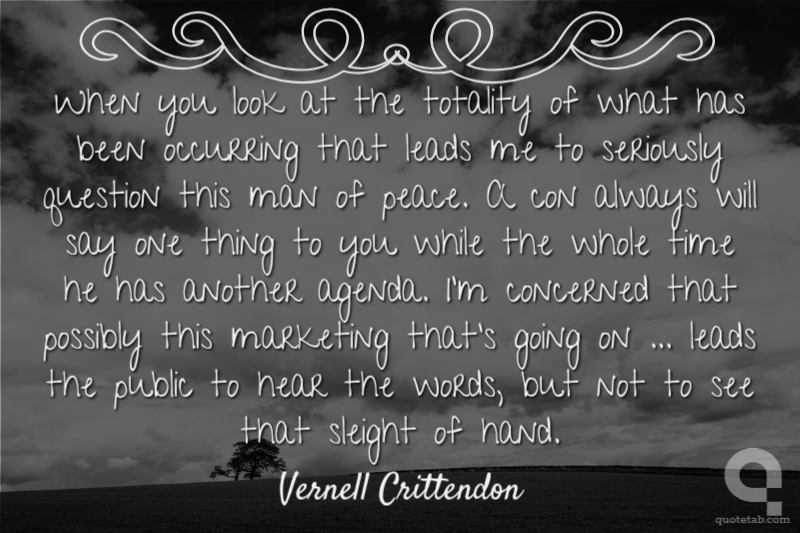 When you look at the totality of what has been occurring that leads me to seriously question this man of peace. A con always will say one thing to you while the whole time he has another agenda. I'm concerned that possibly this marketing that's going on ... leads the public to hear the words, but not to see that sleight of hand.