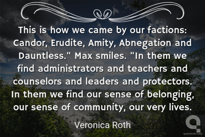 This is how we came by our factions: Candor, Erudite, Amity, Abnegation and Dauntless." Max smiles. "In them we find administrators and teachers and counselors and leaders and protectors. In them we find our sense of belonging, our sense of community, our very lives.