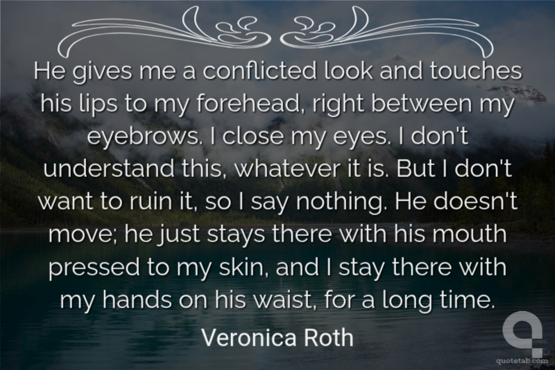 He gives me a conflicted look and touches his lips to my forehead, right between my eyebrows. I close my eyes. I don't understand this, whatever it is. But I don't want to ruin it, so I say nothing. He doesn't move; he just stays there with his mouth pressed to my skin, and I stay there with my hands on his waist, for a long time.