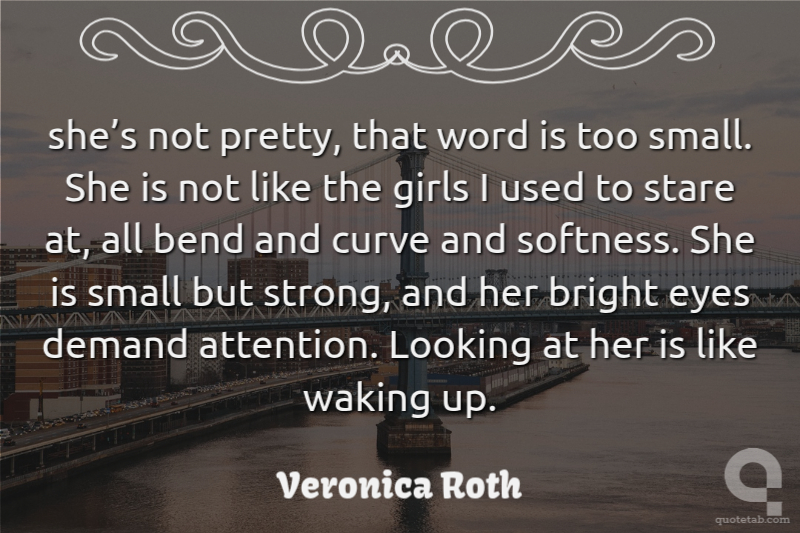 she’s not pretty, that word is too small. She is not like the girls I used to stare at, all bend and curve and softness. She is small but strong, and her bright eyes demand attention. Looking at her is like waking up.