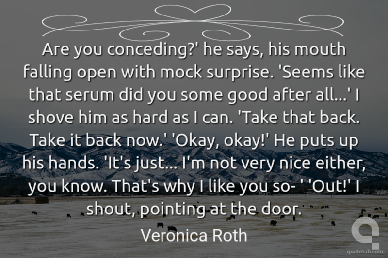 Are you conceding?' he says, his mouth falling open with mock surprise. 'Seems like that serum did you some good after all...' I shove him as hard as I can. 'Take that back. Take it back now.' 'Okay, okay!' He puts up his hands. 'It's just... I'm not very nice either, you know. That's why I like you so- ' 'Out!' I shout, pointing at the door.