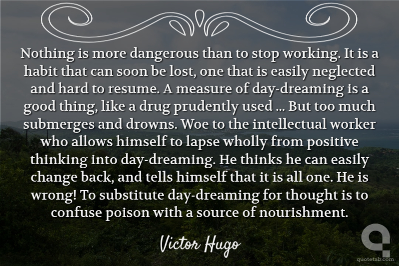 Nothing is more dangerous than to stop working. It is a habit that can soon be lost, one that is easily neglected and hard to resume. A measure of day-dreaming is a good thing, like a drug prudently used ... But too much submerges and drowns. Woe to the intellectual worker who allows himself to lapse wholly from positive thinking into day-dreaming. He thinks he can easily change back, and tells himself that it is all one. He is wrong! To substitute day-dreaming for thought is to confuse poison with a source of nourishment.