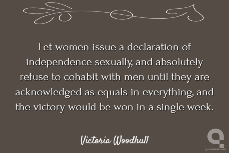 Let women issue a declaration of independence sexually, and absolutely refuse to cohabit with men until they are acknowledged as equals in everything, and the victory would be won in a single week.