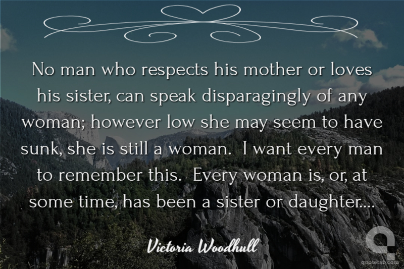 No man who respects his mother or loves his sister, can speak disparagingly of any woman; however low she may seem to have sunk, she is still a woman. I want every man to remember this. Every woman is, or, at some time, has been a sister or daughter....