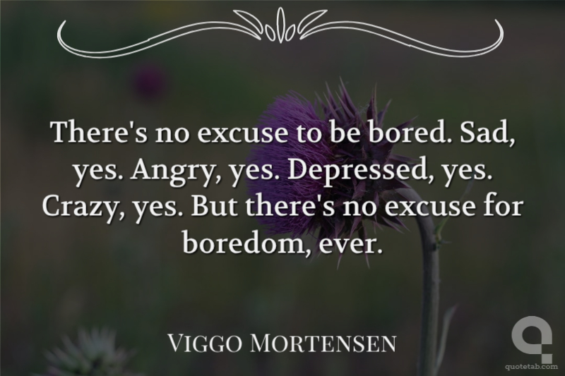 There's no excuse to be bored. Sad, yes. Angry, yes. Depressed, yes. Crazy, yes. But there's no excuse for boredom, ever.